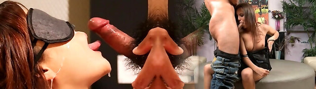 Eager cock sucking and deepthroating brunette duo
