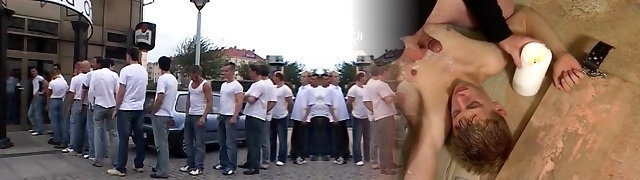 Slutty brunette fucked hard by 30 men in this gangbang film