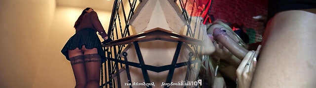 Jeny Smith sneaking to the office building. Nude in elevator and on stairs