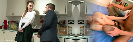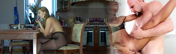 Slender and beautiful white chick in the kitchen tongues man-meat and fucked