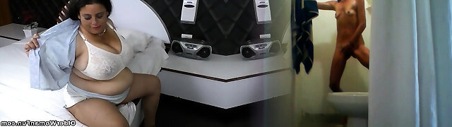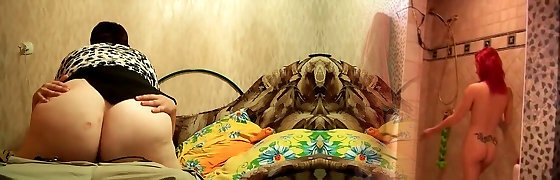 HOT MILF Stepmom Neat her pubic hair & douche in bathroom while Sonny saw her Big Tits & Backside then Stepmom fuck him - cum both