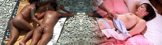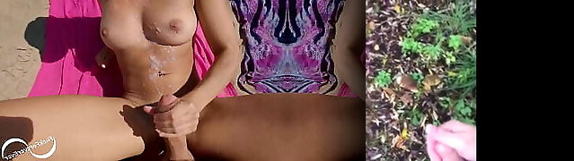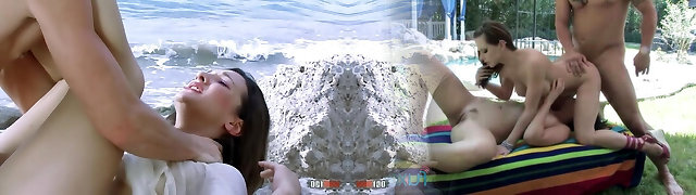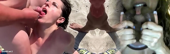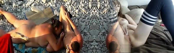 2 boys got busy with fucking holes of lusty brunette bitch on beach