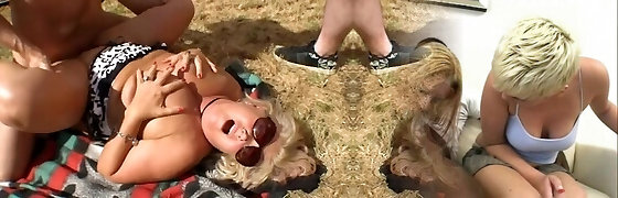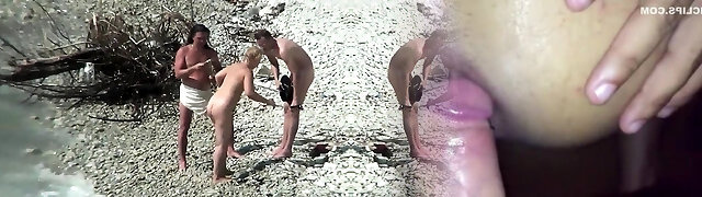Skinny towheaded cougar fucks on a nudist beach with two guys