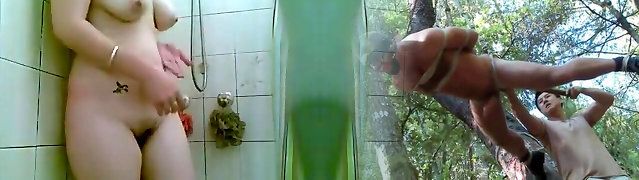 Tied by her hands brunette chick getting her wet pussy hammered up