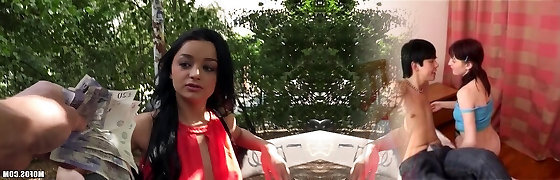 Sweet brunette cutie Carolina gobbles and rides two gigantic cocks in the car