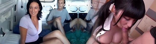 Flamboyant dark-haired babe and two rock-solid schlongs in the van