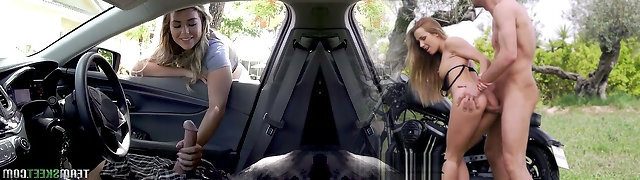 Sexy driver Emily Righ masturbates off a dick in the truck and gets her boobs boned on the bed