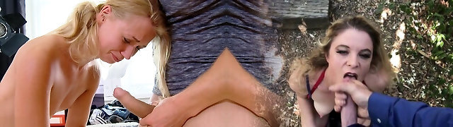 A hot scene with a pretty light-haired on her knees