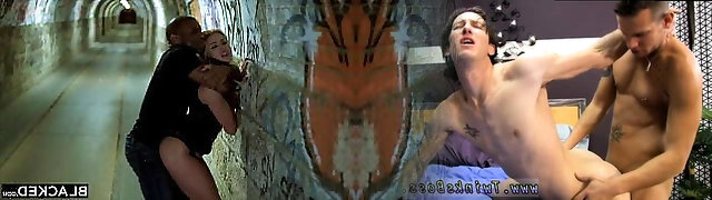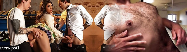 Two tattooed guys double poked naughty Brooklyn Gray behind dumpster
