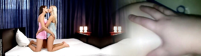 Girls in baby dolls strip in bed and smooch breasts with lust