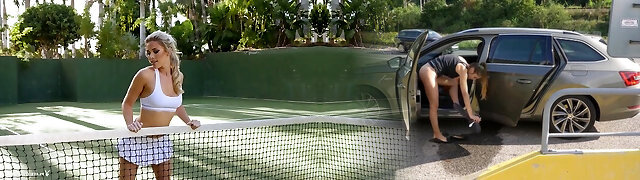 Blonde tennis beauty strips on the court and flaunts her pussy