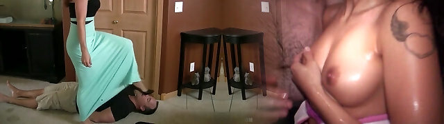 Crazy Dude Worships His Sexy Slim Buxom Black-haired Trans-Mistress, Her Little Dick And Tight Ass