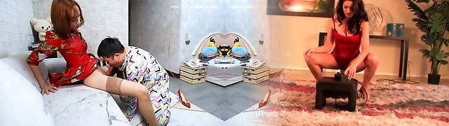 Cozy sole fetish doll puling slave to slurp her pussy in femdom shoot