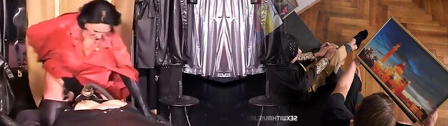 Pretty trans Mistress dominate a gimp and cum in his jaws