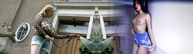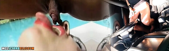 Red-haired Abigaiil Morris is having some naughty fun in the sun wiggling her big tits and ass by the pool, curvaceous brunette Sammy Tor