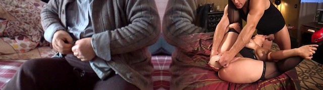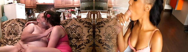 Young brunette licks grandpa all over and porks him