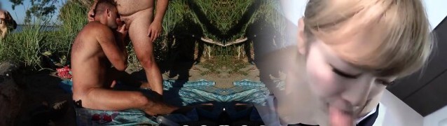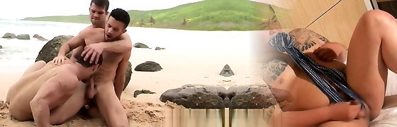 Hot faggot threesome at the beach and double anal