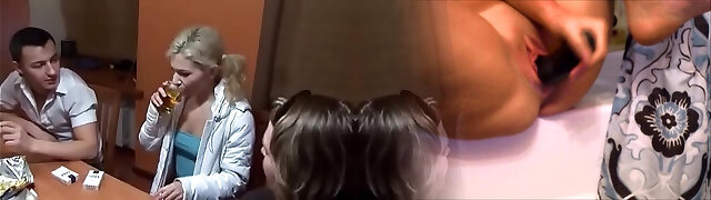 Drunkard blonde giving huge dong blowjob in party gang sex