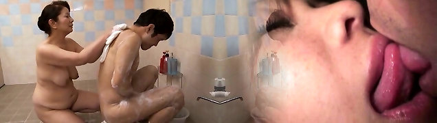 rotondo maturo asiatico chizuru iwasaki accarezzando e soffiando in bagno