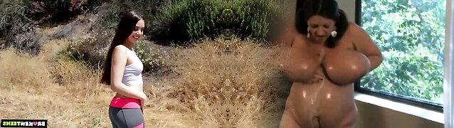 bella di buone dimensioni tittied babe sta facendo esercizi di yoga all'aperto