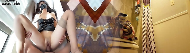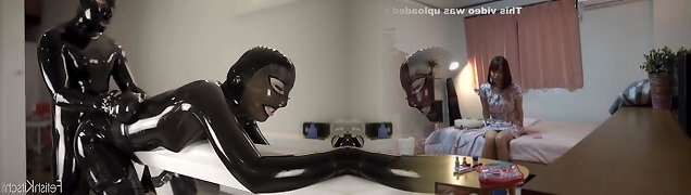 dai grossi seni giapponese super-cagna in lattice scarpe rotaie di spessore dark-hued lancia in posizione cowgirl