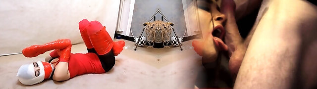 malmenato preservativo fuckslut in rosso spandex catsuit e maschera delimitata schiaffeggiato fatto la pipì