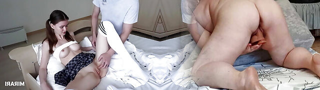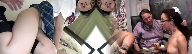 il vecchio insegnante perverso prende due belle studentesse in un motel, una è timida e l'altra è una troia