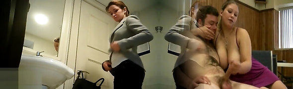 squarcio sgranocchiare e uomo di carne deepthroating in ufficio bagno con collegue