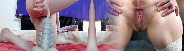 sbattendo la sua fessura su enormi dildo