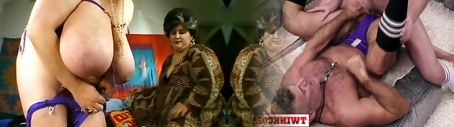Titless mature mega-bitch Eva does her best while pleasing a fat man