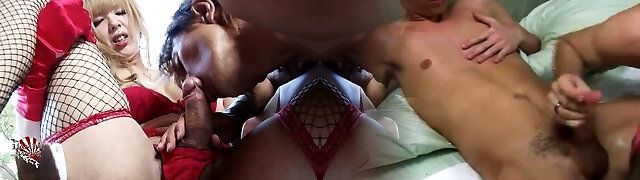 4 naked and horny Latina trans damsels get naked on the bed and start to play with each others milk cans and cocks while