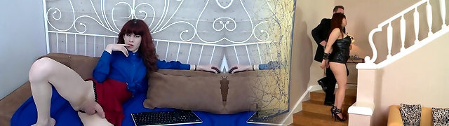Busty trans Ariel Demure deep-throated off by lover during workcall