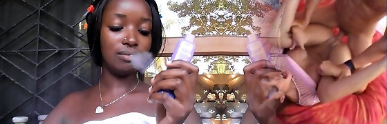 Black bitch with huge tits smoking and jacking
