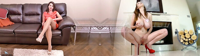 Delicious milf in red dress Lisa Young gets naked and masturbates beaver