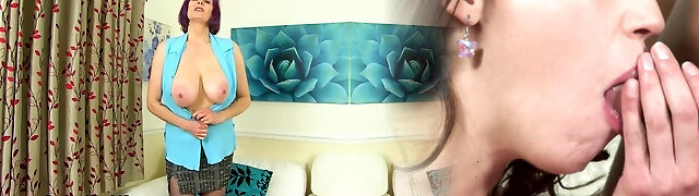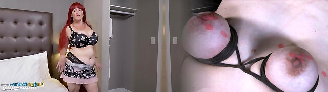 Horny redhead mature girl is showing off her gigantic all innate breasts in striptease video