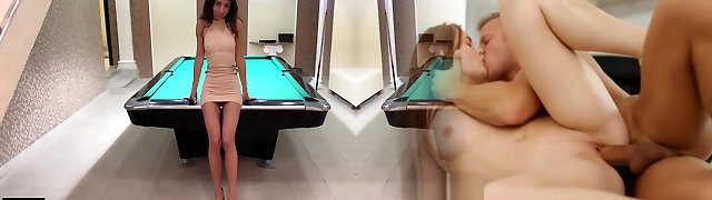 Warm brunette russian chick teases her boyfriend with a striptease and then gets arched over the table and banged