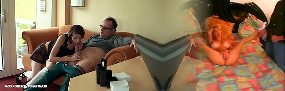 Cute brunette teen provides senior fat fellow with a tender blowjob at home