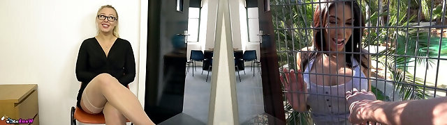 Two red haired milfs give an interview and fondle each other