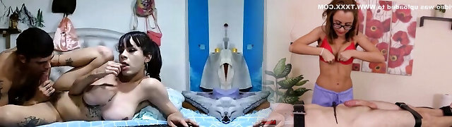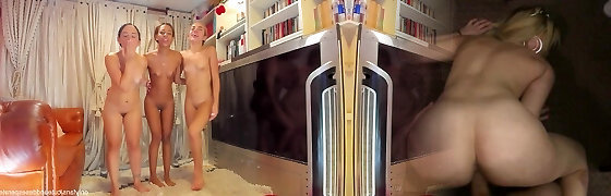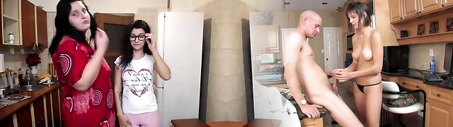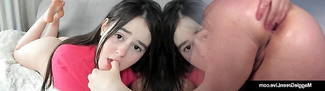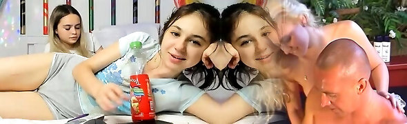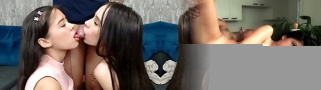 Two young lovely stepsisters share the same firm stiffy during awesome three-way